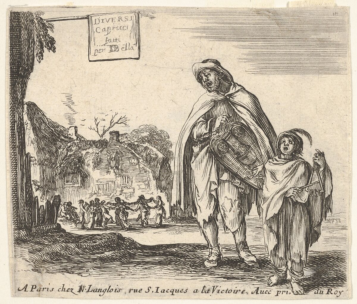 - Title: Plate 1: a man sings and plays the hurdy gurdy, accompanied by a boy playing the triangle to right, a group of peasants dancing in a ring to left in background, title page for "Diversi Capricci"