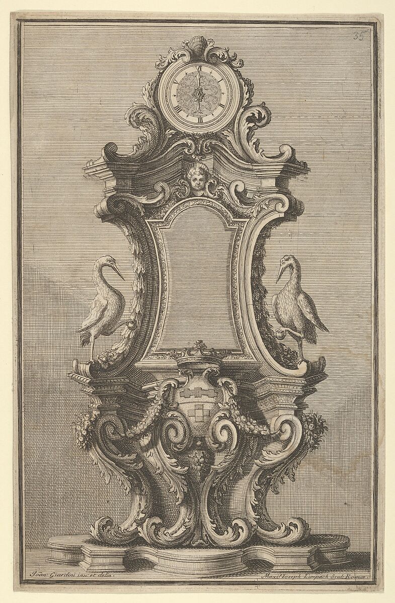 Design for a standing clock, characterized by two birds resting on one leg, on the left and right side of the base. The base consists of four S-shaped scrolls supporting a crowned coat of arms. Above it a mirror is placed. The round clock plate is held in place by two C-volutes and is decorated with leaf-shaped ornaments.