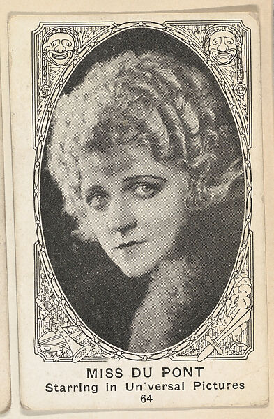 - Title: Card 64, Miss Du Pont, Starring in Universal Pictures, from the Movie Actors and Actresses series (E123), issued by the American Caramel Company