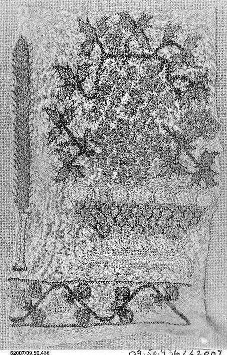 - Medium: Linen, silk, and metal wrapped thread; plain weave, embroidered