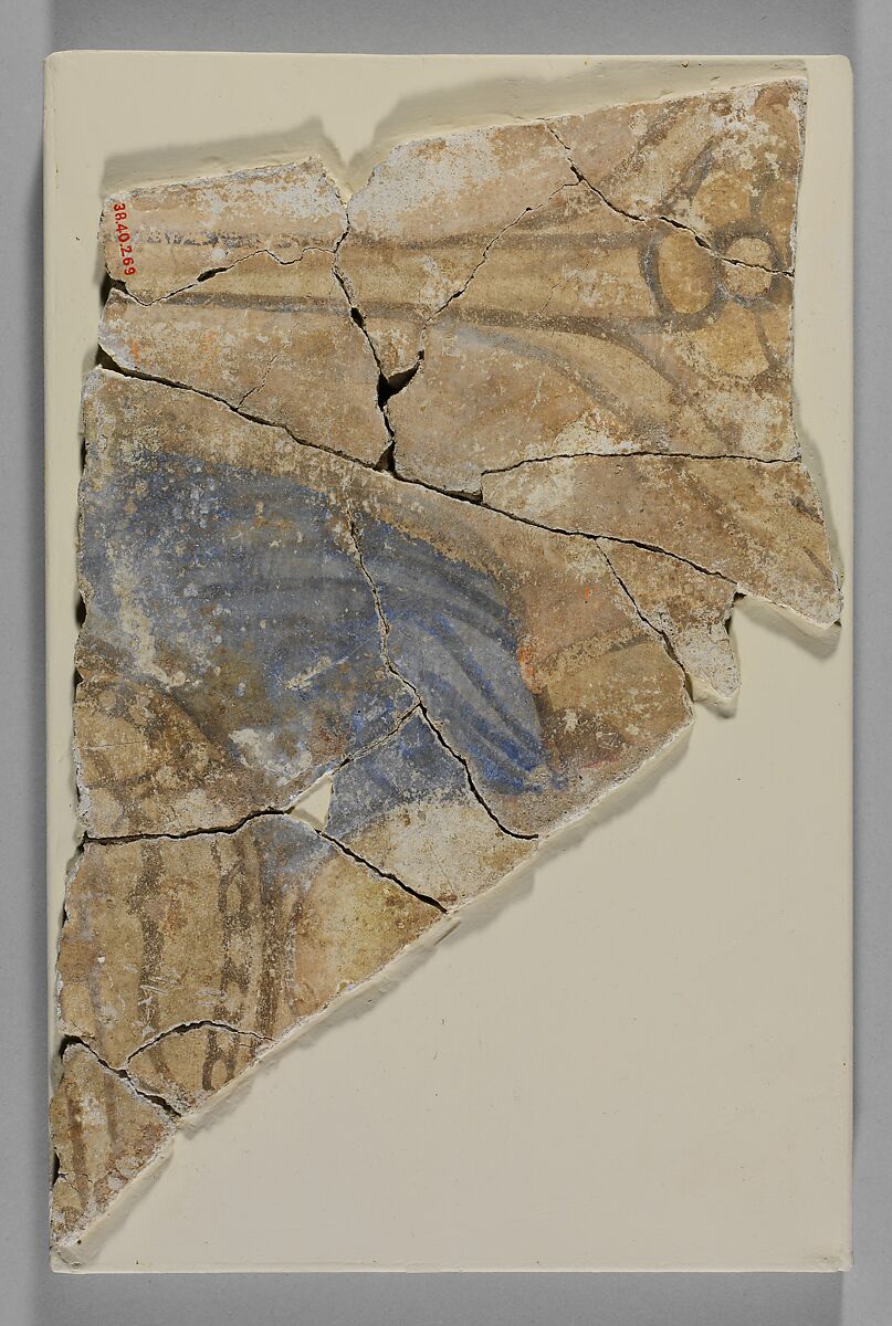 Colored with blue, yellow, black and traces of red, this fragment from a wall painting was excavated from the mound at Nishapur known as Sabz Pushan (the Green Covered). The excavations at Sabz Pushan revealed part of a residential neighborhood dating to the tenth century. This and several similar fragments were found deposited in the bottom of a well dug into the floor of what was likely a domestic unit after having been chipped off a wall and discarded, so their original location is not known. Several are now housed in the Metropolitan Museum, and include 38.40.267, 38.40.268, 38.40.270, 38.40.271.