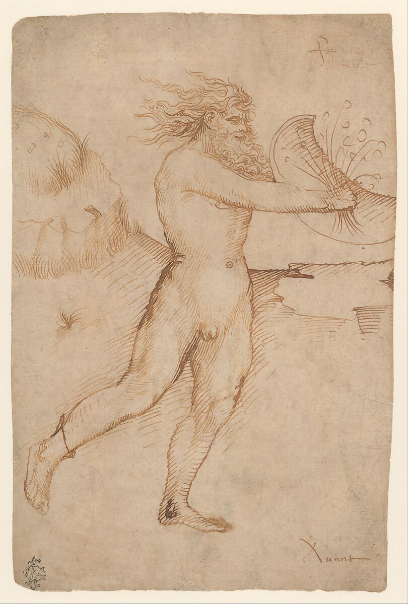 The strong contours of this sheet, seen especially in the treatment of the hair and beard, recalls Stefano da Verona's drawing style, as are the parallel hatched lines used to create shading. The drawing was likely produced by a follower of the artist. The identity of this nude male figure running in a landscape, bearing the attributes of a single boot, a shield, and a spray of flowers, remains enigmatic. It may represent a mythological god -- perhaps Jupiter -- or an allegorical figure. It is also possible that it depicts a wild man, a mythical figure covered in hair who was popular in medieval and Renaissance legend. Symbolizing strength and the balance between the human and natural world, wild men were frequently depicted bearing a heraldic shield.