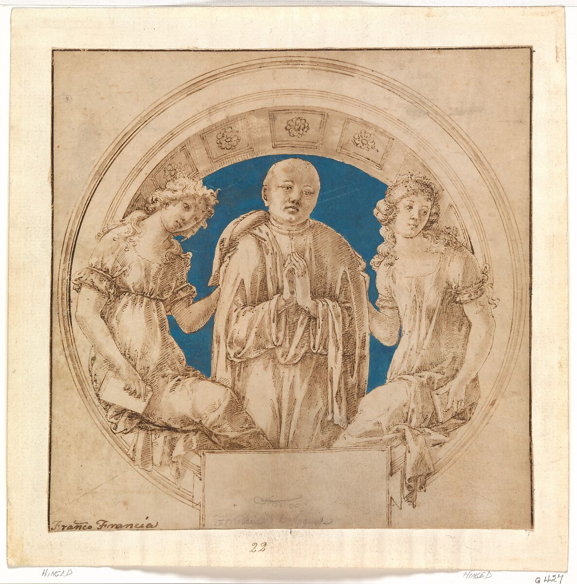 Francesco di Giorgio was a Sienese sculptor, painter, illuminator, architect, and military engineer. The precise function of this drawing is uncertain; it may record an idea for a tomb sculpture or perhaps a painting. The foreshortened architectural perspective and the downward gaze of the figures suggest the work was intended to be placed high on the wall of a chapel or nave. The male figure in the center, flanked by muses or figures representing the liberal arts, may portray the patron, suggesting a memorializing function. Alternatively, this vellum sheet may have served as the frontispiece for Francesco di Giorgio’s treatise on machines, in which case, the male figure may be a self-portrait of the artist.