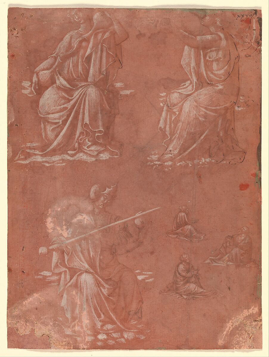 This rare metalpoint drawing has historically been attributed to the preeminent early fifteenth-century Florentine painter Lorenzo Monaco, and considered part of the album of drawings that belonged to the sixteenth-century biographer and artist, Giorgio Vasari. Vasari's writings on Lorenzo Monaco describe a chiaroscuro drawing of theological Virtues made "with such fine design in so beautiful and graceful a style that it may well be better than the drawings of any other master of those times." This is indeed a chiaroscuro drawing depicting three Virtues, and the Roman numerals written at the upper right (in the same ink used to retrace the drapery) suggest that perhaps as early as the sixteenth century this was one of a series of sheets, or a page in a collector's album. Yet the evidence is insufficient to give the drawing to Lorenzo Monaco. More recently, the drawing has been ascribed to contemporary early fourteenth-century Florentine artists such as the Master of the Judgment of Paris, Giovanni dal Ponte, and Gherardo Starnina (Master of the Bambino Vispo). Through white heightening, the artist carefully studied the dramatic play of light upon the rhythmic, cascading folds of drapery. The identification of the three Virtues as Temperance, Hope, and Fortitude (or Justice) has great resonance, given their attributes and gestures. The seated old man, shown in three poses, may depict a prophet.