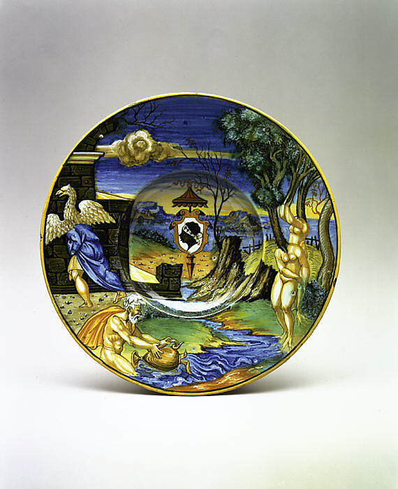 Thirty-seven pieces from the maiolica service survive (including four in the Lehman Collection: see also 1975.1.1131; 1975.1.1134; 1975.1.1137), all painted in Urbino by the celebrated maiolica painter Francesco Xanto Avelli da Rovigo in 1532 and 1533. Some pieces were sent to Gubbio to be completed with luster decoration under Xanto’s direction.