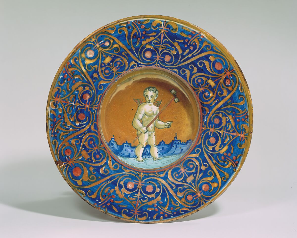 This small lustered bowl is typical of ceramics made in Gubbio in the 1520s and 1530s. The meaning of the boy playing with a pinwheel is uncertain, but it relates to imagery found on birth trays.