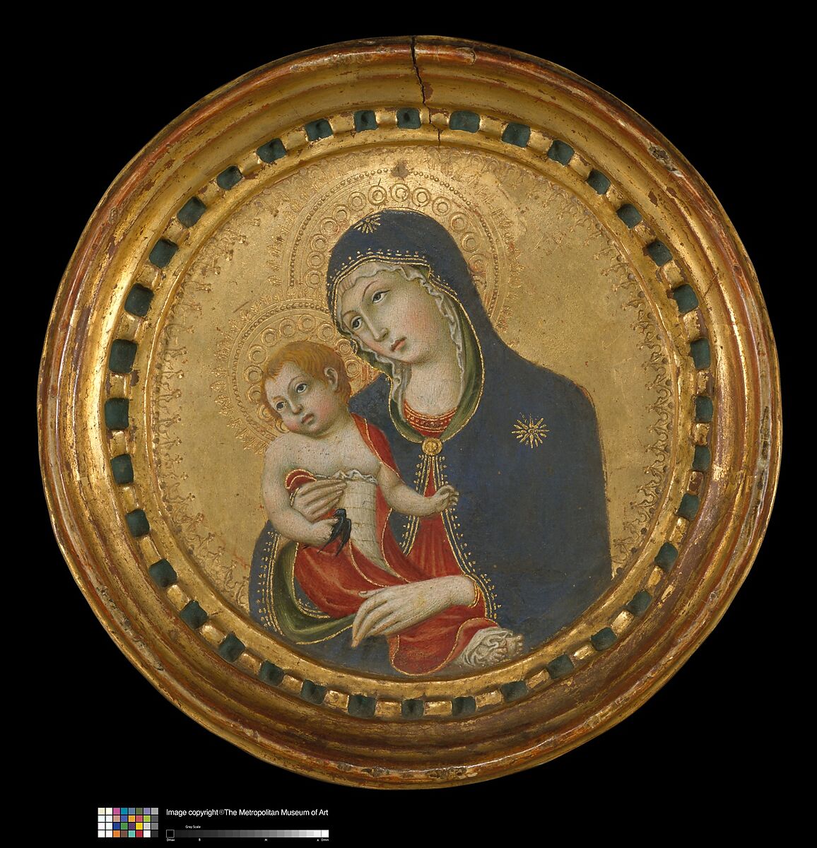This "Madonna and Child" by Sano di Pietro (1405-1481) retains its original frame carved in one with the panel. The molding is proportionally rather deep for the scale of the painting. The alternating blue and gilt blocks of the dentil that encircle the Virgin and Child like a halo of stars are due to the intervention of the restorer/faker Icilio Federico Joni, who described this panel and its companion in his biography of 1936. An identical roundel framed the "Stigmatization of Saint Francis" by Sano di Pietro, also owned by Giulio Grisaldi del Taia and then F. Mason Perkins in the early twentieth century. The companion roundel has since disappeared.