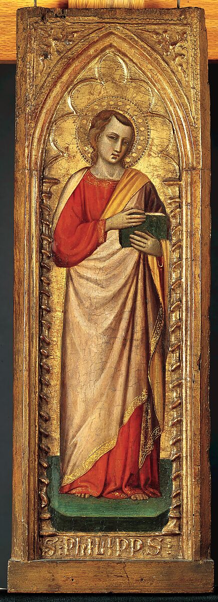 Spinello Aretino (1350/52-1410) painted these two panels depiciting Saints Philip and James the Greater(?) for an altarpiece for Monte Oliveto Maggiore near Siena. Other panels from the same polyptych survive in the Pinacoteca Nazionale, Siena; the Szépmuvészeti Múzeum, Budapest; and the Fogg Art Museum, Cambridge, Massachusetts. Another pilaster panel like the two in the Robert Lehman Collection was sold at Sotheby's in London in 1982. An inscription across the base of the altarpiece frame, recorded by Giorgio Vasari when it was still intact, memorialized the frame carver and the gilder alongside the painter: "Simone Cini Fiorentino fece l'intaglio, Gabriello Saracini la messe d'oro e Spinello di Luca d'Arezzo la dipinse l'anno 1385." The three artists received equal payments for their work. The pastiglia Solomonic columns on these two panels are not as well defined as those on 1975.1.23b, which are subtly delineated with punching. The simple punching on these panels with vague pastiglia moldings befits the humble manner of the two saints.