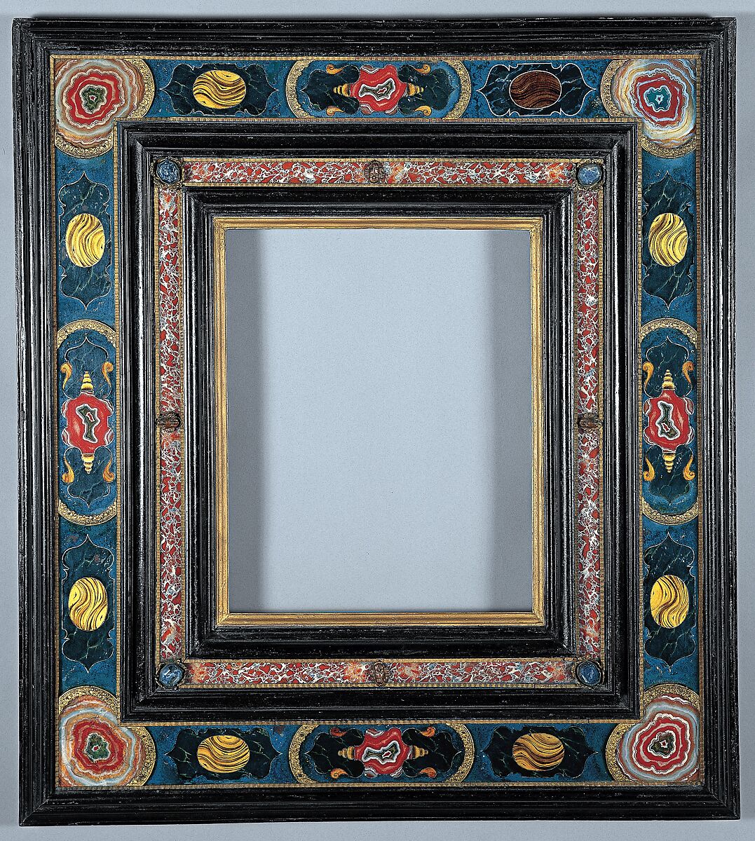 - Medium: Poplar back frame with applied ebonized pearwood upper moldings; glass. Half-lapped back frame. Sight edge: oil gilt. Friezes: verre églomisé, or reverse-painted glass, held in with bronze-colored ripple moldings and gilt-bronze panel ends, and painted to resemble stone mosaic.