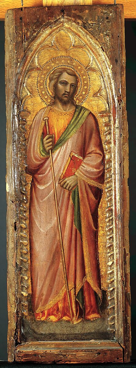 Spinello Aretino (1350/52-1410) painted these two panels depiciting Saints Philip and James the Greater(?) for an altarpiece for Monte Oliveto Maggiore near Siena. Other panels from the same polyptych survive in the Pinacoteca Nazionale, Siena; the Szépmuvészeti Múzeum, Budapest; and the Fogg Art Museum, Cambridge, Massachusetts. Another pilaster panel like the two in the Robert Lehman Collection was sold at Sotheby's in London in 1982. An inscription across the base of the altarpiece frame, recorded by Giorgio Vasari when it was still intact, memorialized the frame carver and the gilder alongside the painter: "Simone Cini Fiorentino fece l'intaglio, Gabriello Saracini la messe d'oro e Spinello di Luca d'Arezzo la dipinse l'anno 1385." The three artists received equal payments for their work. The pastiglia Solomonic columns on these two panels are not as well defined as those on 1975.1.23b, which are subtly delineated with punching. The simple punching on these panels with vague pastiglia moldings befits the humble manner of the two saints.