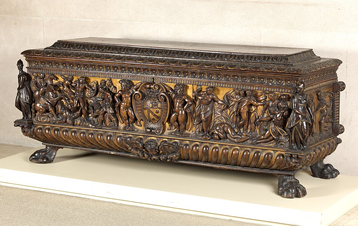 - Medium: Walnut, carved and partially gilded; coniferous wood.