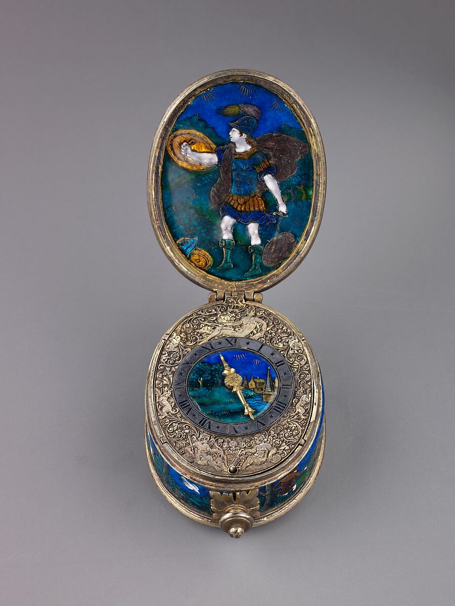 - Medium: Case of brass with plaques of painted enamel on copper, partly gilt and partly silvered, and silver-gilt mounts. Dial of brass with traces of gilding and with a silver chapter of hours; in the center a disk of painted enamel on copper and a gilt-brass hand.