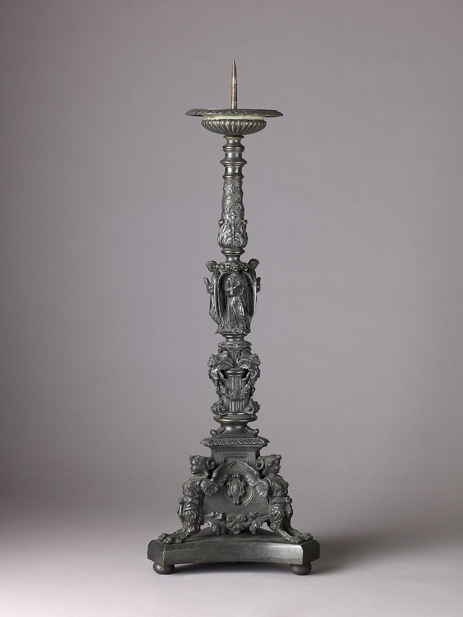 The eclectic and inconsistent style of this candlestick with figures of caryatids and putti, including Renaissancestyle elements (the top section and dripping pan) as well as later motifs (the cannelured column and praying angels), the fake coat of arms, and the superficial chemical patina, point to a nineteenth-century date. The monogram SB on one of the escutcheons could be a playful reference to the name of the caster, possibly S. Bitti.