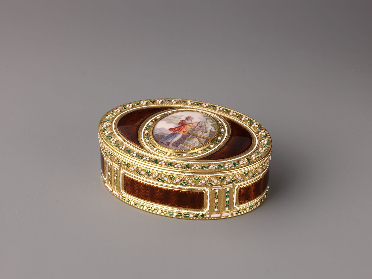 No charge mark for gold and small silver work was registered at the outset of the new tax farm in 1781, although this was corrected two years later. Boxes made in the interim were struck with the mark seen on this box. The fashion for boxes that accommodated other media in their design encouraged the production of miniatures on vellum, ivory, or enamel from which the goldsmiths or retailers could choose. The randomness of subject matter is indicated by 106 such miniatures sold from the Cottin collection in 1752, which included royal and anonymous portraits; genre, landscape, and allegorical scenes; pastoral and biblical subjects; and birds.