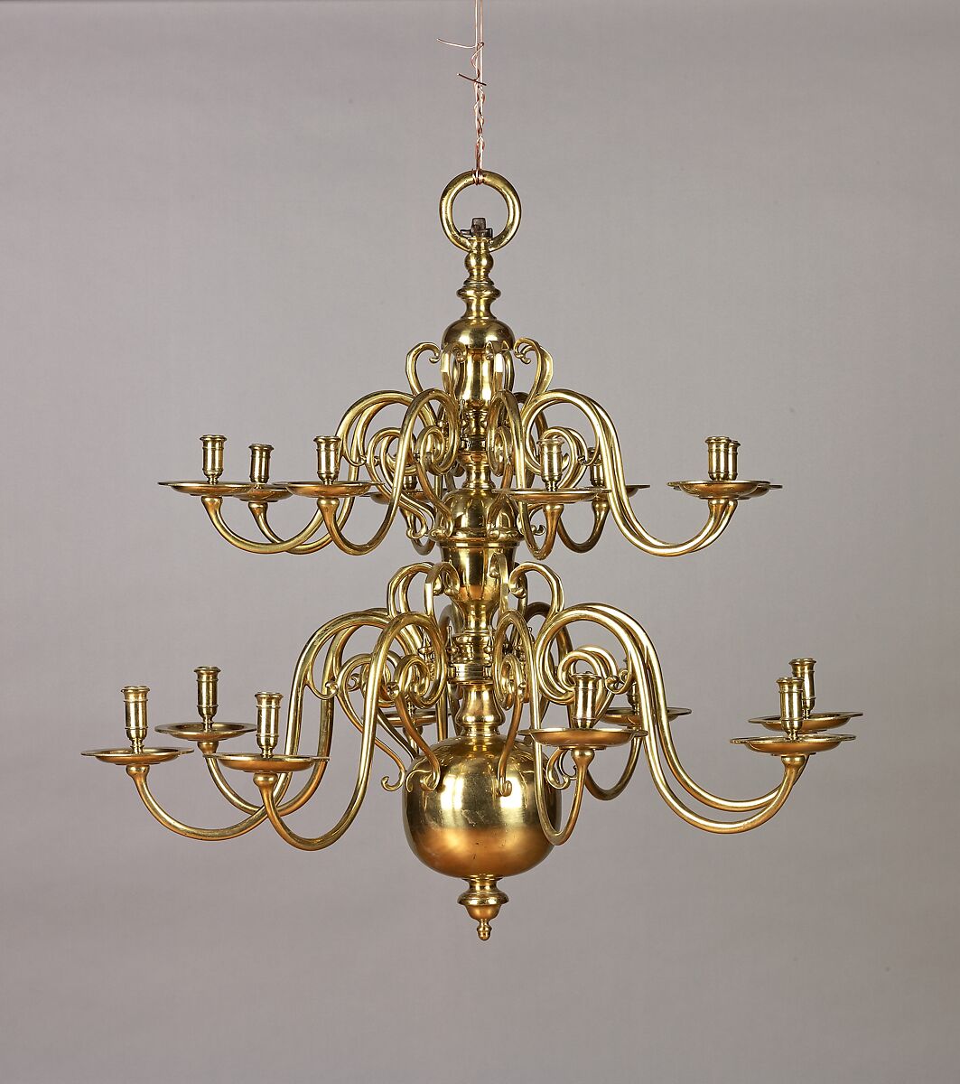 The chandelier has two series of eight S-shaped branches around a baluster stem resting on a massive globe. The branches and shaft have been correspondingly numbered from one to eight with a system of small bars arranged in two horizontal rows around the two central discs of the baluster. One of the attachment-pegs has been replaced. The slender, baluster-shaped pegs and the acorn-shaped finials are characteristics of a number of eighteenth-century chandeliers from Rotterdam.