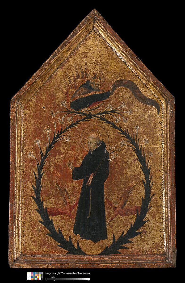 The delicate balance between the flat top edge and the hollow below it on this gabled molding ornamented only with punched bands acknowlege the fine draftsmanship of the "Exaltation of Saint Nicholas of Tolentino" by Giovanni di Paolo (ca. 1400-1482). The decorative palm fronds that cross above Nicholas's head and the fluttering scroll held by Saint Augustine serve to divide the composition. The panel was never part of a larger structure.