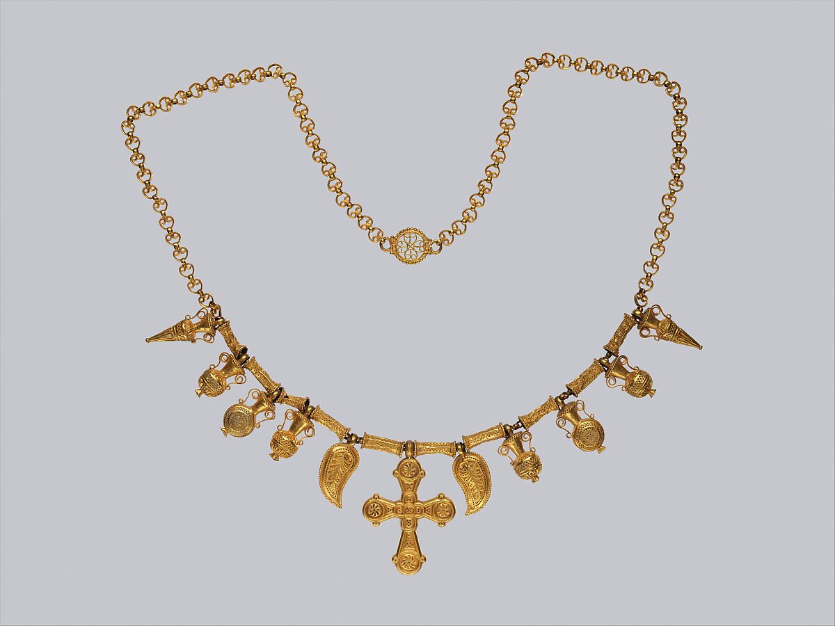 The eleven extensively detailed ornaments—a cross, a pair of leaves, and eight amphorae (vases) of varying shapes—are separated by hexagonal gold spacers meant to resemble miniature columns.