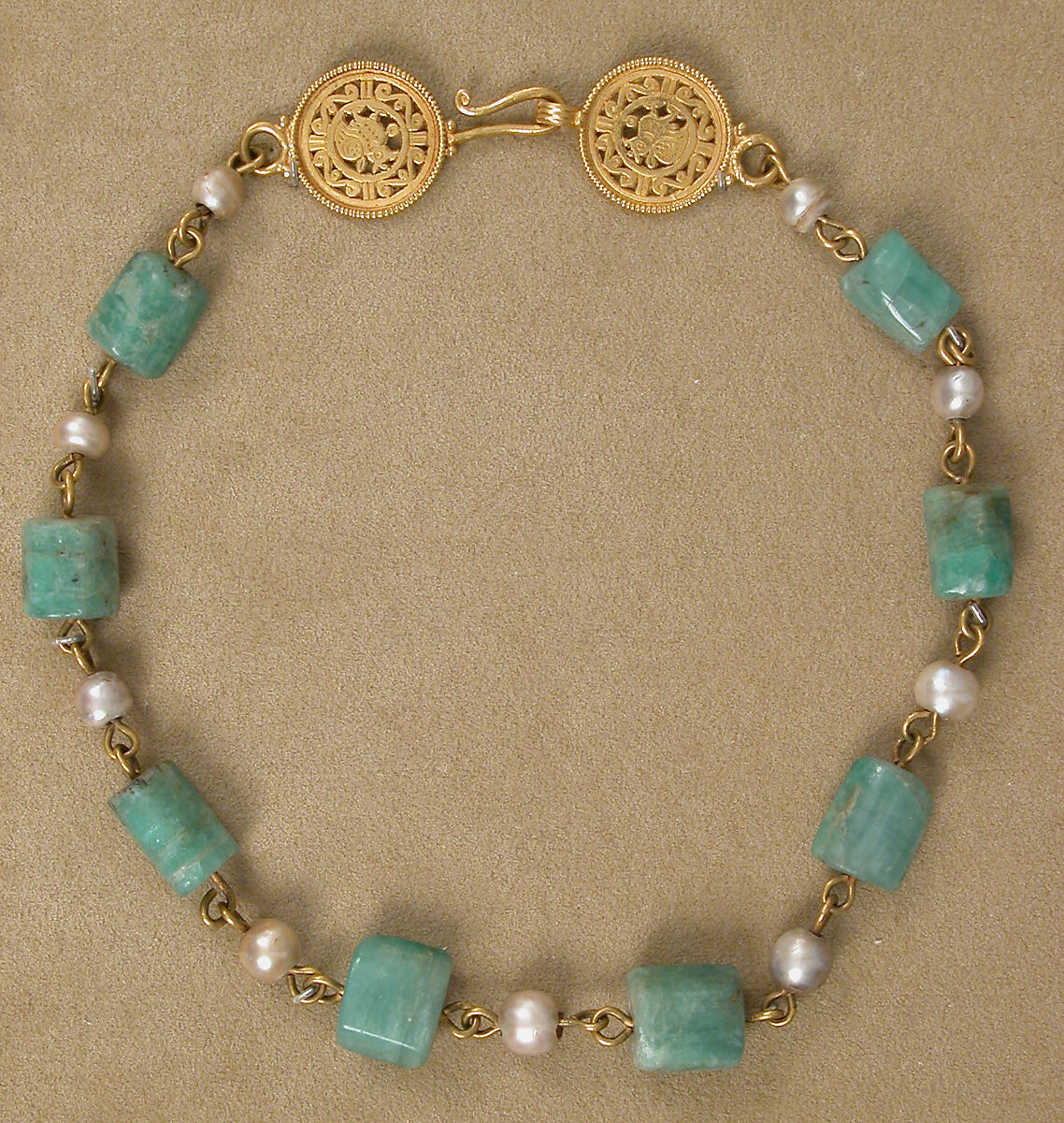 This elegantly simple necklace alternates luminous white pearls with soft green gems worked from a type of quartz, one of several stones that were called emeralds in Byzantium.