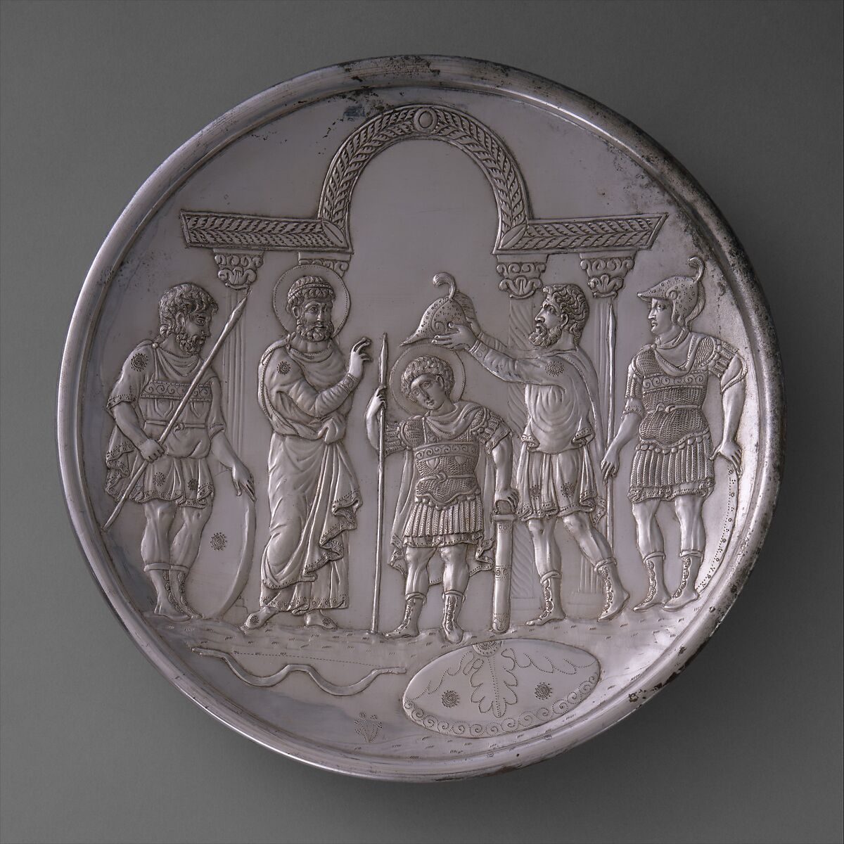 In 628–29 the Byzantine emperor Herakleios (r. 610–41) successfully ended a long, costly war with Persia and regained Jerusalem, Egypt, and other Byzantine territory. Silver stamps dating to 613–29/30 on the reverse of these masterpieces place their manufacture in Herakleios’s reign. The biblical figures on the plates wear the costume of the early Byzantine court, suggesting to the viewer that, like Saul and David, the Byzantine emperor was a ruler chosen by God. Elaborate dishes used for display at banquets were common in the late Roman and early Byzantine world; generally decorated with classical themes, these objects conveyed wealth, social status, and learning. This set of silver plates may be the earliest surviving example of the use of biblical scenes for such displays. Their intended arrangement may have closely followed the biblical order of the events, and their display may have conformed to the shape of a Christogram, or monogram for the name of Christ.