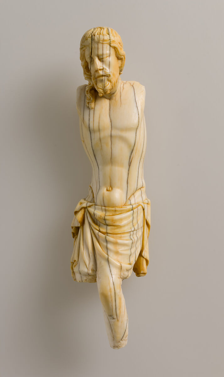 The suffering of Christ on the cross was so important in Gothic art that the mid-thirteenth-century statute of the corporations of Paris included a guild dedicated to the carving of such images, including ones in ivory. This ivory sculpture of Christ, whose pathos and agony are beautifully conveyed, was executed in the round and most certainly was intended for an altar cross. In spite of the loss of both arms and parts of the legs (which originally were attached to the body by means of pegs), the modeling of the figure reveals a profound sensitivity to form and expression. The powerful anatomical structure—portraying, naturally, the corporeality of the dying Christ—is remarkable for a crucifix of this period. The closed eyes and the long hair, which falls down the back and right side of the head, reveal the emotional impact of death. A subtle twist in the torso was produced in part by the positioning of the legs, which were crossed and mounted on the cross with a single nail.