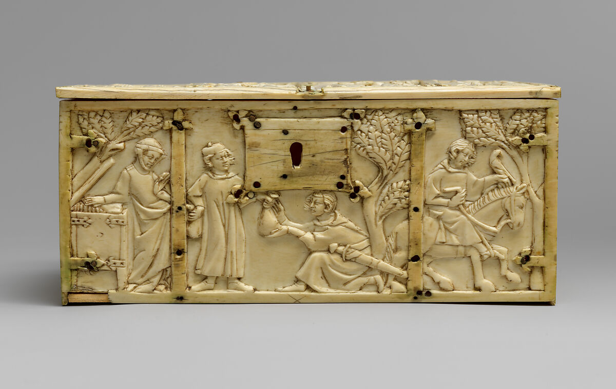 The biblical parable of high living, disgrace, and paternal reconciliation (Luke 15:11–32) was an appropriate subject for this casket, intended to hold valuables. The missing scene of the Return of the Son was probably intended for the lid; instead, the replacement lid illustrates the stages of love.