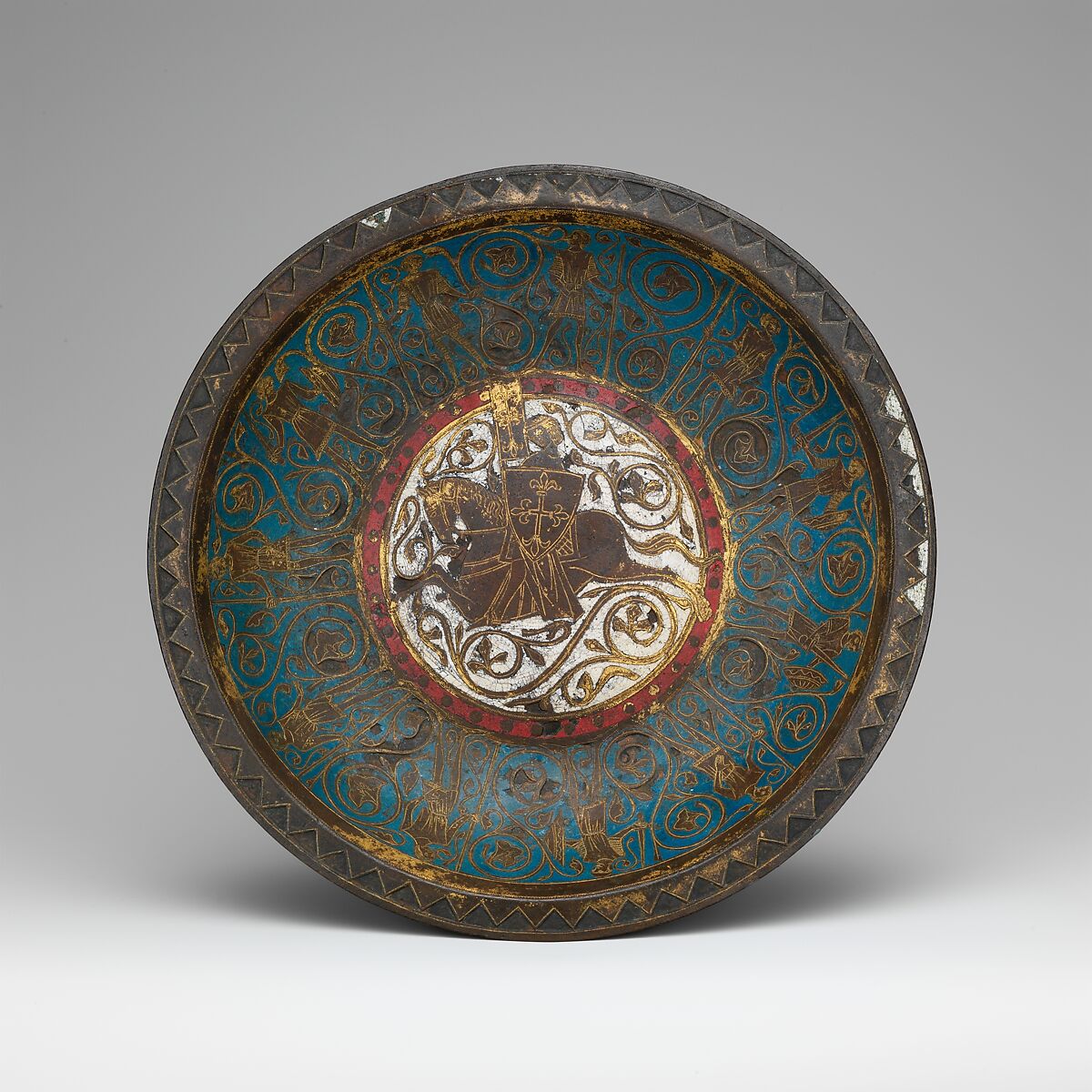 - Medium: Copper, wrought and gilt, and champlevé enamel: medium blue, red and white