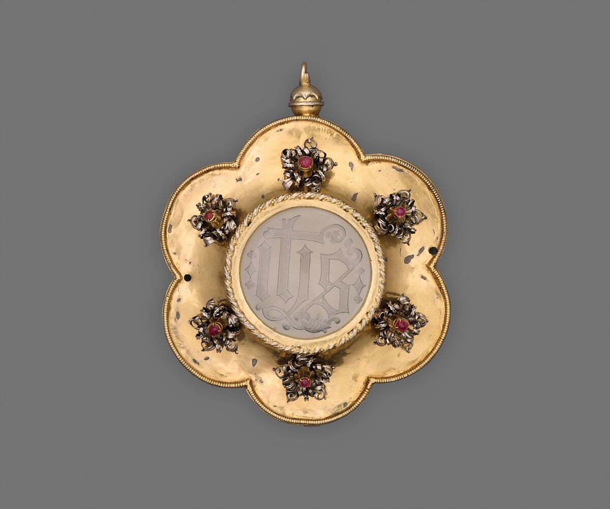 This ornate pax was used during the celebration of Mass for the kiss of peace. The engraved letters IHS in the rock crystal are a monogram of the Greek name for Jesus. The Virgin and Child flanked by St. James the Greater and a female saint (perhaps Dorothy) are engraved on the back of the pax. On the inside of the back plate is an inscription indicating that Jacob Ostrofski presented the pax to the church of Blonie (near Warsaw) in 1529.