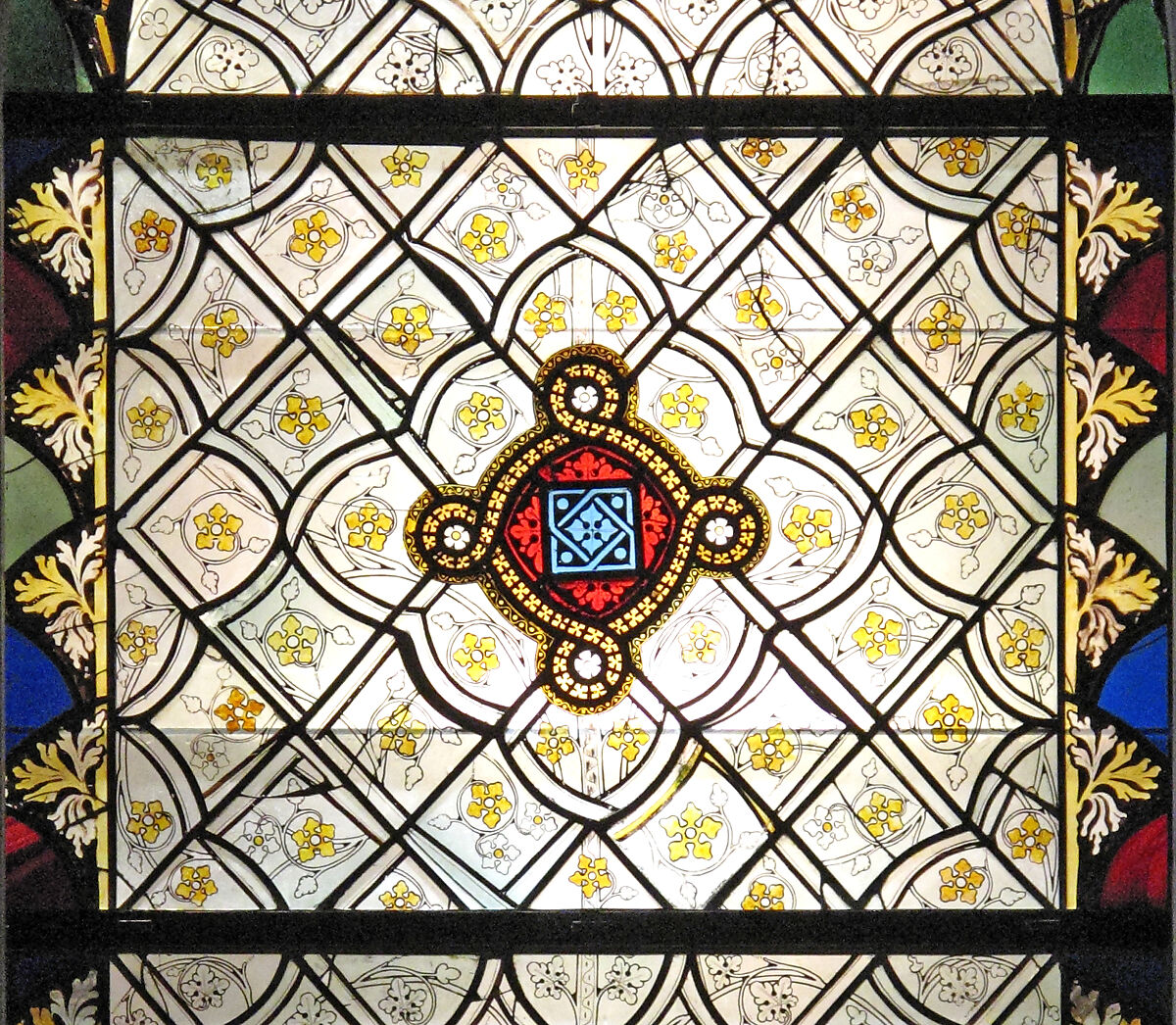 The five panels assembled here come from at least four different lancets of the choir windows at Saint-Ouen at Rouen. They incorporate three different patterns of stylized leaves and tendrils, one with silver-stained blossoms, and three different strapwork designs in four combinations. All are known to have originated in this glazing program. The botanical theme is continued in the border pattern and in three of the central bosses or fermaillets. The combination of grisaille, silver stain, and colored glass is typical of fourteenth-century French stained glass.