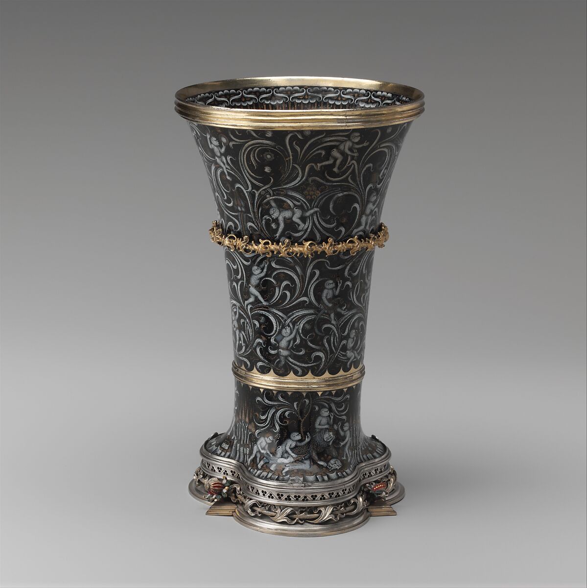 Ce gobelet, l’un des plus beaux exemples d’émaux exécutés au Moyen Âge pour une table princière, illustre une légende populaire sur la folie des hommes. Un vendeur ambulant, représenté juste au-dessus de la base, dort si profondément qu’une bande de singes le dévalisent et le dévêtent sans parvenir à l’éveiller. Certains d’entre eux jouent dans les branches avec les marchandises volées. Tous les objets traités avec la technique peu commune de l’émail peint en grisaille sont associés à la cour des ducs de Bourgogne.