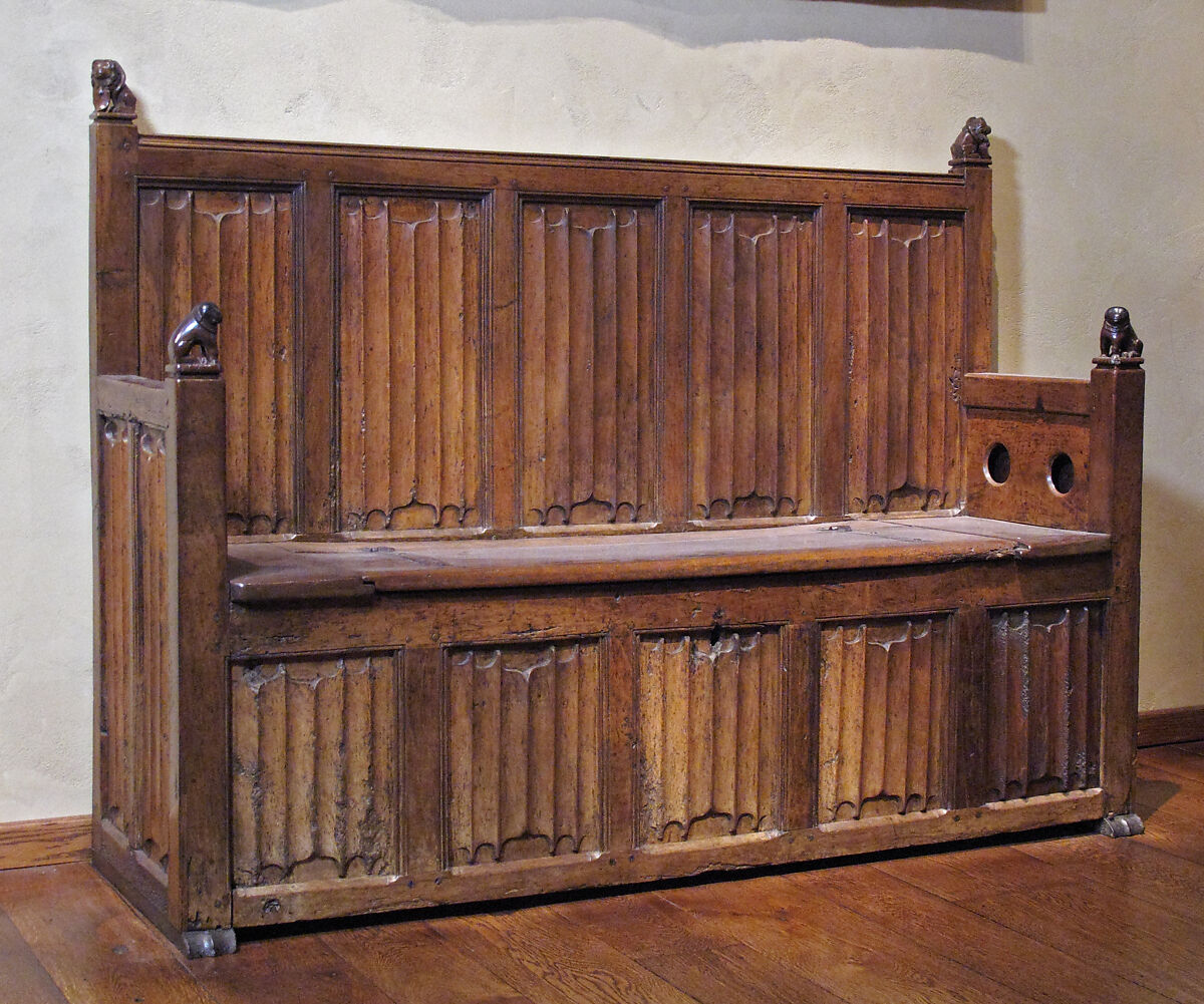 Like the bench depicted on the central panel of Campin's Annunciation Triptych, in this room, this bench is decorated with finials in the form of lions and dogs. The hinged seat could be lifted so that the cavity underneath could serve as a storage space.