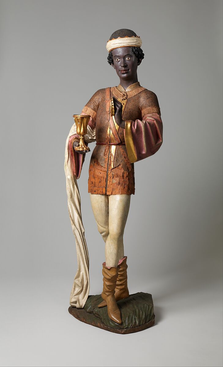 One of a group of wooden sculptures representing the Adoration of the Magi, this figure initially stood behind an altar in a German church. The New Testament account tells of wise men offering gifts to the infant Jesus, but it gives neither the number of individuals nor their ethnicities. Medieval literature and art, however, depict the Magi as three kings from far corners of the known world, including Africa. Trade routes, diplomatic excursions, and increased contact between Europe and Africa in the medieval period led to more images of people of African descent in art, particularly in scenes of this subject. The Magus’ elegant pose and contemporary attire are reminiscent of a medieval royal courtier. For its original audience, this figure represented an imagined African ruler and a reverent, wise man from a distant world.