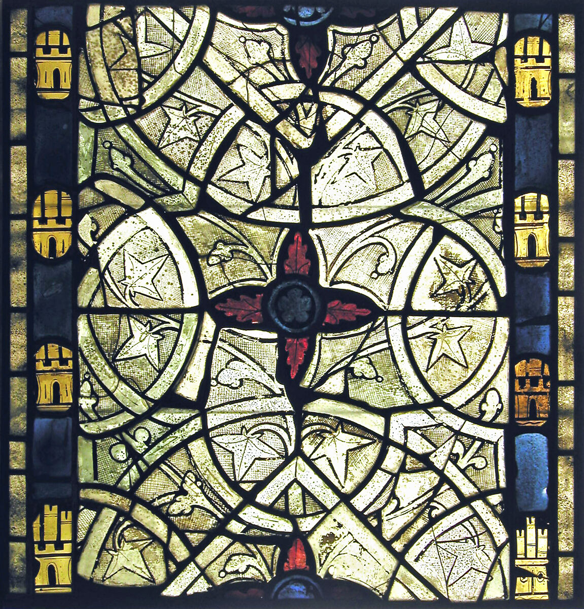 These glass panels may have originally decorated one of the chapels of the Château de Bouvreuil, which was built by King Philip Augustus (r. 1179-1223) and expanded by his grandson Louis IX (r. 1226-70). The castles in the window's border are devices of the kingdom of Castile and indicate Louis's claim to the Spanish throne through his mother, Blanche of Castile. The top panels in each lancet are modern.