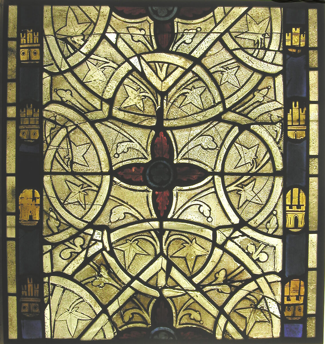 These grisaille panels are part of a set of eight from a window in one of three chapels at the Norman residence of the French monarchs. They represent a mid-century transitional stage in royal French ateliers. The conventionalized acanthus buds are a continuation of earlier tastes, while the ivy leaves, delineated with hair-thin veins, reflect the newer, naturalizing tendencies. The castles in the border are devices of the kingdom of Castile and indicate royal patronage, probably that of Louis IX (1226-1272), who claimed the right to the Spanish throne through his mother, Blanche of Castile.