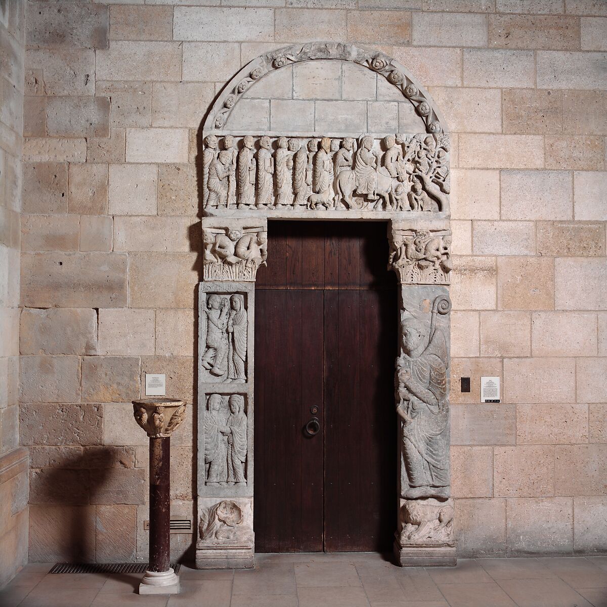 Dédié à saint Léonard, patron des prisonniers, ce portail était l’entrée principale de la petite église de San Leonardo al Frigido, en Toscane. Un sarcophage antique fut réemployé en guise de piédroits. La portion de gauche est composée d’une Annonciation et d’une Visitation, et celle de droite montre saint Léonard tenant un prisonnier emblématique. L’Entrée à Jérusalem, qui décore le linteau, est inspirée d’un relief qui ornait une tombe des débuts du christianisme, signe d’un regain d’intérêt pour cette période dans l’Italie du XIIe siècle.
