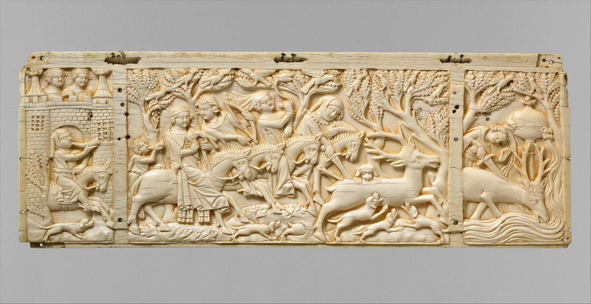 The stag hunt, one of the principal secular themes of the Middle Ages, is here eloquently portrayed in ivory. The action begins at the left with hounds and hunters on horseback departing the castle. In a wooded setting women lure falcons, while the hunter has shot an arrow at the stag as hounds torment it; finally, as the stag seeks relief from the waters of a fountain, the hunter delivers the coup de grace with his sword. In medieval poetry such courtly themes were also regarded allegorically as the hunt for love.
