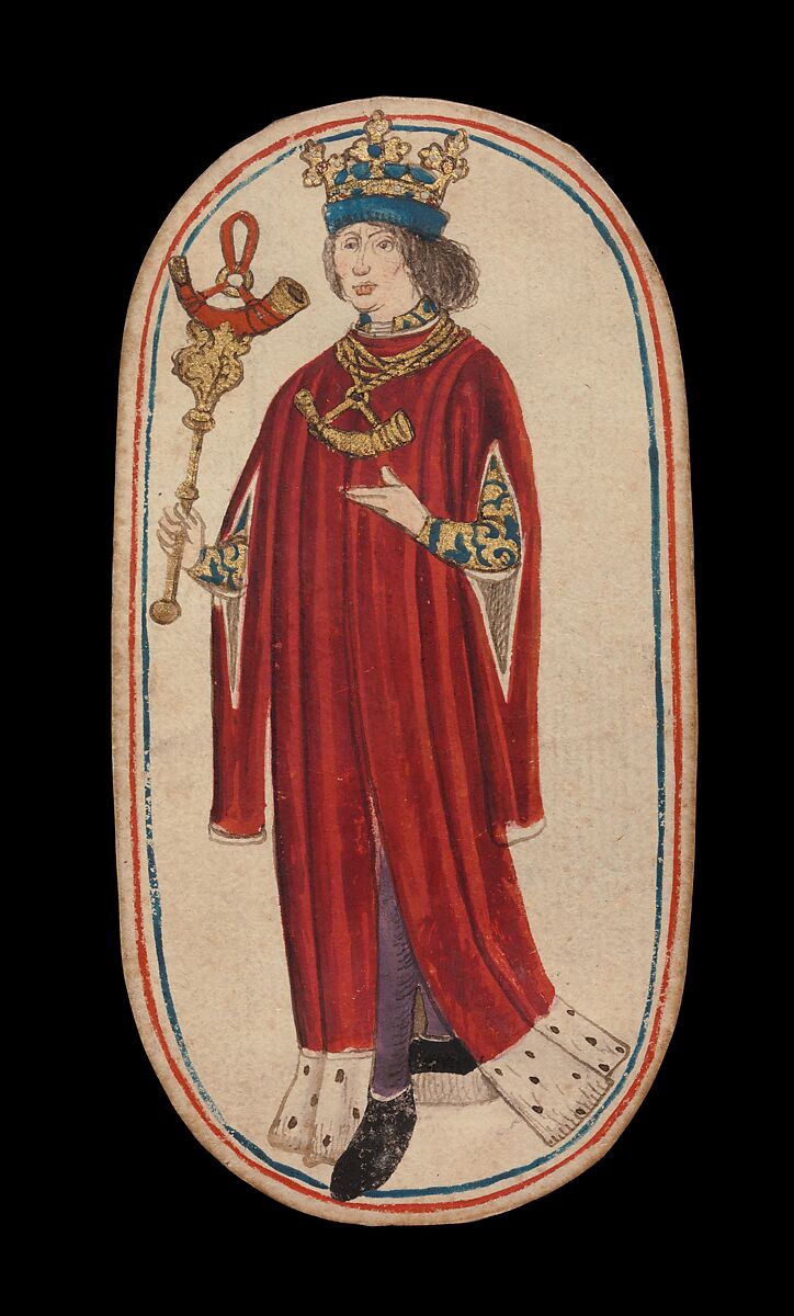 The Cloisters set of fifty-two cards constitutes the only known complete deck of illuminated ordinary playing cards (as opposed to tarot cards) from the fifteenth century. There are four suits, each consisting of a king, queen, knave, and ten pip cards. The suit symbols, based on equipment associated with the hunt, are hunting horns, dog collars, hound tethers, and game nooses. The value of the pip cards is indicated by appropriate repetitions of the suit symbol. The figures, which appear to be based on Franco-Flemish models, were drawn in a bold, free, and engaging, if somewhat unrefined, hand. Their exaggerated and sometimes anachronistic costumes suggest a lampoon of extravagant Burgundian court fashions. Although some period card games are named, it is not known how they were played. Almost all card games did, however, involve some form of gambling. The condition of the set indicates that the cards were hardly used, if at all. It is possible that they were conceived as a collector’s curiosity rather than a deck for play.
