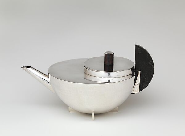 During its brief existence (1919–33) the Bauhaus produced a group of architects and designers whose work profoundly influenced the visual environment of the twentieth century. Brandt's tea infuser is the quintessential Bauhaus object. Only three inches high, its diminutive size results from its function. Unlike conventional teapots, it is intended to distill a concentrated extract, which, when combined with hot water in the cup, can produce tea of any desired strength. Here, the usual elements of a teapot have been reinvented as abstract geometric forms. The handle, a D-shaped slice of ebony set high for ease of pouring, provides a strong vertical contrast to the object's predominant horizontality. Although the pot’s functionality is carefully resolved, its visual impact lies in the uncompromising sculptural statement it makes. It is defiantly modern.
