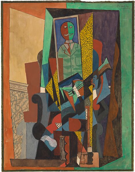 After several years of working in oil and papier collé, this work heralds Picasso’s return to the media of watercolor and gouache. It also revisits one of his favorite themes, the man with a guitar, who is shown here within a teetering environment of interlocked and colored planes. Clearly recognizable elements (a guitar, the scrolled side of an armchair, faux-marble wallpaper) compete with illegible, opaque forms. The man, who appears as if framed by a doorway or reflected in a mirror, is neither fully abstract nor fully convincing as a figure. In fact, he may not be a man at all: his rigid form and simple outline recall the tailors’ mannequins that appear in the paintings of Giorgio de Chirico, an artist in whom Picasso was deeply interested at the time.