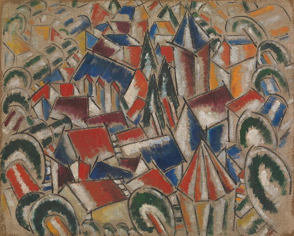 One of the canvases in the Contrasts of Forms series, The Village presents an aerial view of a walled community with angled roofs, rounded trees, and a medieval church with buttresses and a bell tower. It is likely that Léger did not directly observe this scene, but constructed the image from memory of travel, or possibly even of another painting. The composition embodies "the law of plastic contrasts" that Léger sought to explore through careful oppositions of line, form, and color. In this, he was strongly influenced by Paul Cézanne, whom he credited with teaching him to "love forms and volume." While The Village depends on a new pictorial vocabulary, it also relies on traditional techniques of atmospheric perspective and chiaroscuro (the use of light and shadow to create the illusion of three-dimensionality). Forms decrease in size and colors lighten moving from the fore- to the background of the canvas. Léger applied color, however, with little regard for naturalism; his observance of chiaroscuro developed into an exploration of the syncopation that black and white can invigorate across a surface.