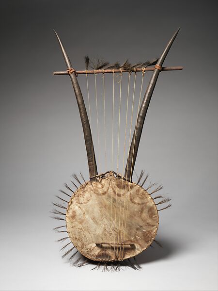 Decorative lyre. Lyres have two wood or horn arms that project from the body and carry a crossbar to which the upper ends of the strings are fastened. The strings lie nearly parallel to the soundtable. African lyre bodies are made of wood, gourds, tortoise or coconut shells. Although this example is fitted with a bridge, most African lyres lack this feature allowing the strings vibrate against the soundtable to create a buzzing sound.