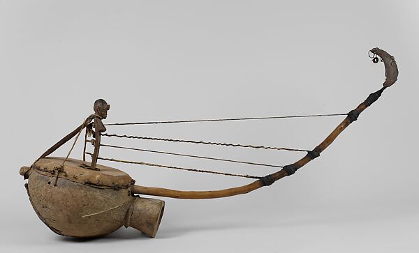 Harps and zithers with vertical bridges are found along the west coast from Senegambia to Angola. This large harp has a wood resonator and an extension on one side, unlike most, which have gourd resonators. Drums accompany this harp during Senufo funerary ceremonies for exceptional hunters, a tradition followed by other groups in the region.