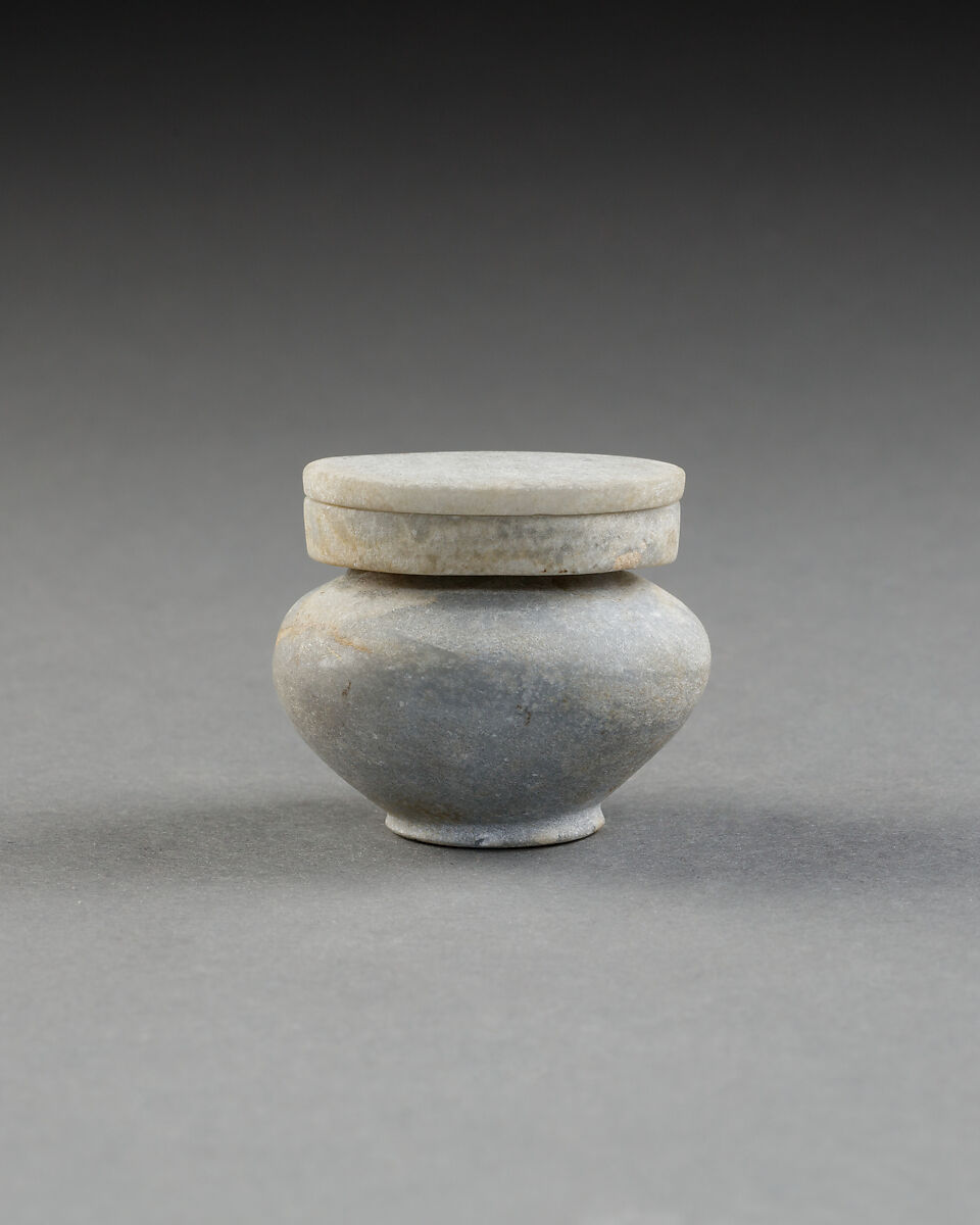 A pit in the portico of the rock- cut tomb MMA 840 in the Asasif area of the Theban necropolis contained the remains of a coffin, a group of fine jewelry and two toilet vessels (13.180.1-13.180.3; 13.180.4a–i; 13.180.5a, b; 13.180.6-13.180.11; 13.180.19a–c; 13.180.20). The dates of these objects range from the late Middle Kingdom (ca. 1850-1700 B. C.) through the Second Intermediate Period (ca. 1700-1550 B. C.). Similarly shaped stone vessels to this one found, for instance, at Dahshur, Haraga and other sites date this piece into the late Middle Kingdom.