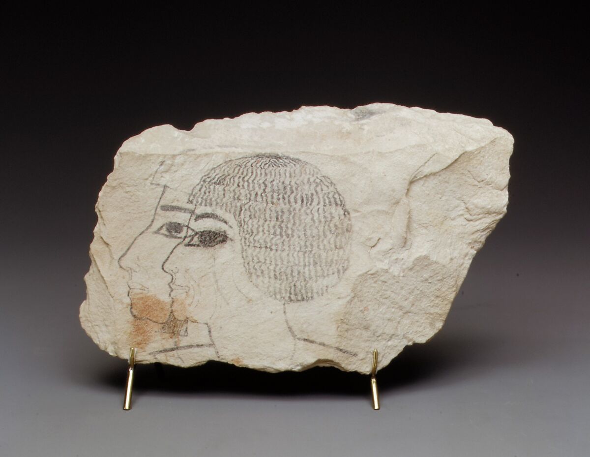 Ostraca are chips of limestone or fragments of pottery that were used as writing surfaces by ancient Egyptian scribes, or as sketch pads by artists. Despite the lack of any identifying text, the double profile on this ostracon can easily be identified as Senenmut, one of Hatshepsut's well-known courtiers. The profiles are similar to the representation of Senenmut on another ostracon in the Museum's collection (36.3.252) and to a drawing on a wall in his tomb (fig. 1). On the back of this ostracon is a sketch that depicts a small rodent.