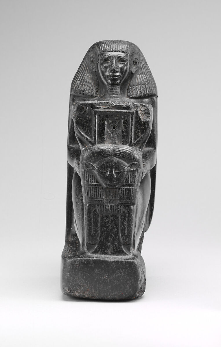 In this small statue, Senenmut is shown holding a large sistrum, a kind of rattle used in religious ceremonies. The sistrum was particularly associated with the goddess Hathor, whose emblem (a woman with cow's ears) decorates the front.