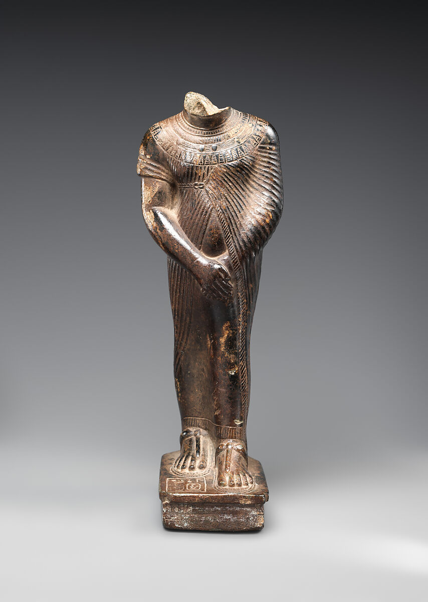 The portly profile of the king identifies this as a work from late in the reign of Amenhotep III. The back pillar is in the form of a djed-pillar, a hieroglyph symbolizing stability. The inscriptions associate the king with the Theban god Amun-Re and it has been suggested that this statuette was dedicated as part of Amenhotep's third Heb-Sed, a rejuvenation ceremony celebrated in year 37 of his reign.