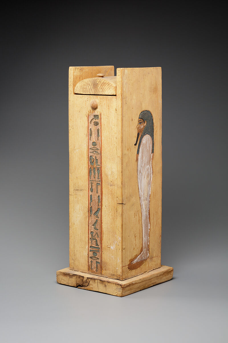 This painted shabti box is inscribed for a man named Yuya whose daughter, Tiye became the principal queen of Amenhotep III. Although not of royal lineage, as in-laws of the king, Yuya and his wife Tjuyu were given a sumptuous burial in the royal cemetery now known as the Valley of the Kings. Their tomb (KV 46) was discovered in 1905 by Theodore M. Davis, an American businessman from Rhode Island. Because the tomb was intact, having escaped detection by ancient robbers, the majority of the objects were retained by the Egyptian Antiquities Service and are now in the Egyptian Museum in Cairo. However, Davies was allowed to keep a small portion of the finds which he later bequeathed to the Metropolitan Museum.