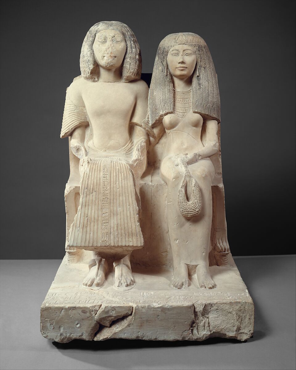 These figures represent Yuny seated next to his wife Renenutet. Yuny, who lived in the city of Asyut, was a chief royal scribe and holder of many other offices, perhaps including that of physician. Additional inscriptions on the base of the statue further elaborate Yuny's responsibilities. On the center fold of Yuny's pleated skirt is an inscription that reads: "May everything that comes forth upon the offering table of [the god] . . . and all pure food that comes forth from the Great Enclosure [the temple complex at Heliopolis] be for the chief scribe, royal scribe of letters, Yuny, justified."