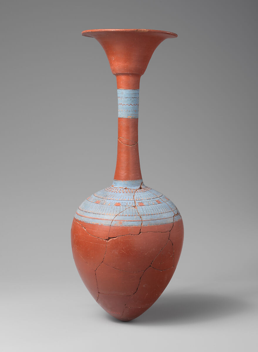 This slender, elegant bottle, with its flaring rim in the form of an open papyrus umbel, was among the cache of objects discovered in a pit (KV 54) in the Valley of the Kings in 1907. The objects are associated with the funeral of Tutankhamun, whose tomb was discovered some fifteen years later about 200 feet away. The decoration around the neck imitates floral collars made of leaves, petals, flower buds, and berries that were worn by banquet guests and draped around vessels used at banquets. Several such collars (see 09.184.214) were also found in the cache. This bottle may have been used in the purification ritual at Tutankhamun's burial or to serve a spiced beverage at his funeral banquet.