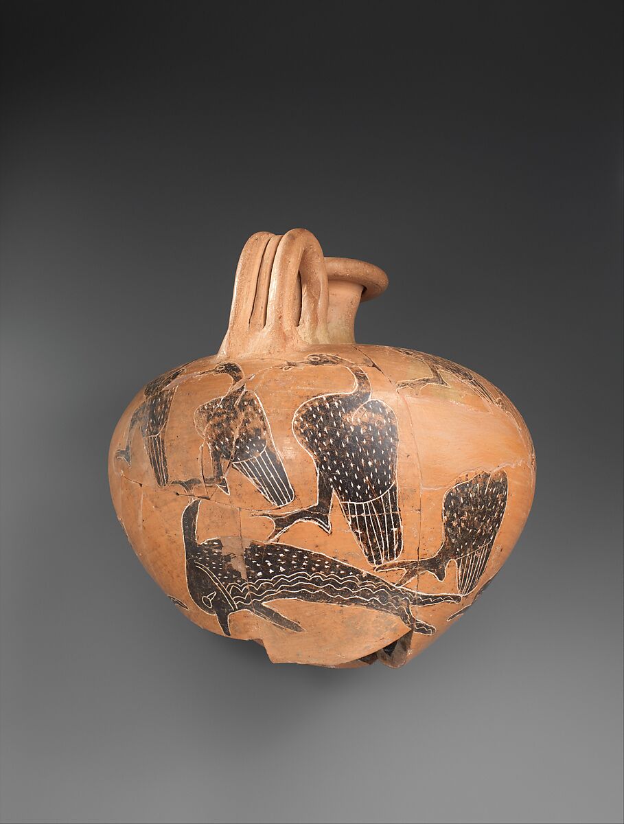 Three dolphins move around the foot of the jug, with three large birds (possibly geese) above each of them; a smaller bird is tucked below the handle. Is this perhaps an image of the Levantine coast, with dolphins in the water and migratory geese coming to rest on the beach? A Dynasty 13 date is suggested by other objects found in the same tomb shaft.
