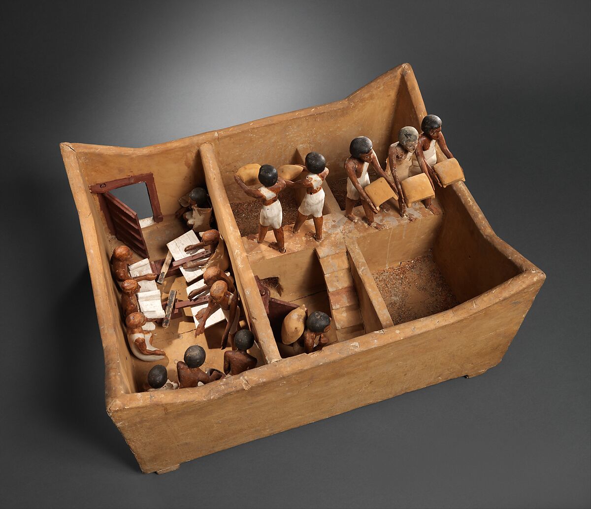 All the accessible rooms in the tomb of Meketre had been robbed and plundered already during Antiquity; but early in 1920 the Museum's excavator, Herbert Winlock, wanted to obtain an accurate floor plan of the tomb's layout for his map of the Eleventh Dynasty necropolis at Thebes and, therefore, had his workmen clean out the accumulated debris. It was during this cleaning operation that the small hidden chamber was discovered, filled with twenty-four almost perfectly preserved models. Eventually, half of these went to the Egyptian Museum, Cairo, and the other half came to the Metropolitan Museum in the partition of finds.
